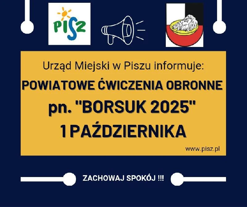 Urząd Miejski w Piszu informuje, że 1 października 2025 roku na terenie miasta odbędą się powiatowe ćwiczenia obronne doskonalące pod kryptonimem „Borsuk 2025”.