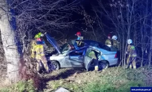 Do drugiego poważnego zdarzenia w powiecie piskim doszło w piątek 24.04.2026 r. po godz. 20.00 na drodze krajowej nr 58 między Piszem a Białą Piską. Kierujący Volvo, omijając jelenia, który wbiegł na jezdnię, stracił panowanie nad autem, zjechał do rowu, uderzył w drzewo i dachował.